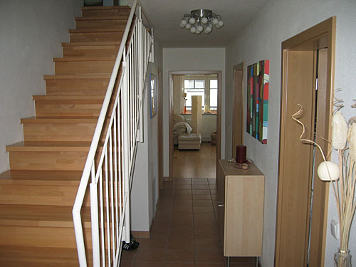 Sie erreichen Ihre Wohnung über ein eigenes schönes, breites Treppenhaus und kommen in den praktischen Flur mit schönen Fließen in Terracotta-Optik. Aus dem Flur können Sie in die Wohnräume und nach oben in die Schlafräume gehen.