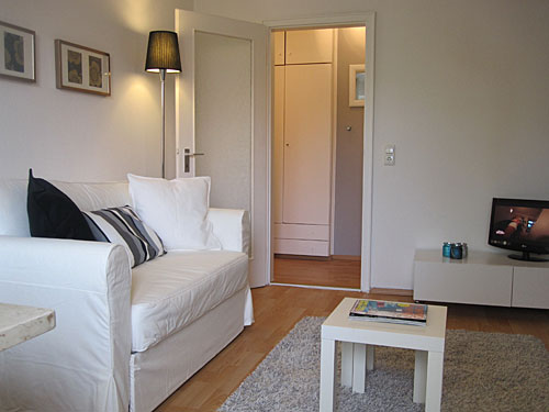 Living room: Sofa-bed (120cm wide), Dining table with 2 chairs, Shelves, Decoration, 22“ Flat-Screen-TV with Kable TV, Lights.
